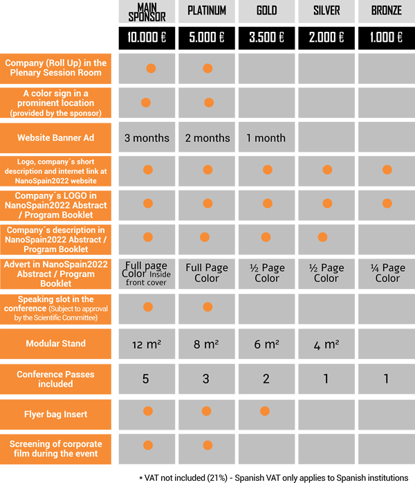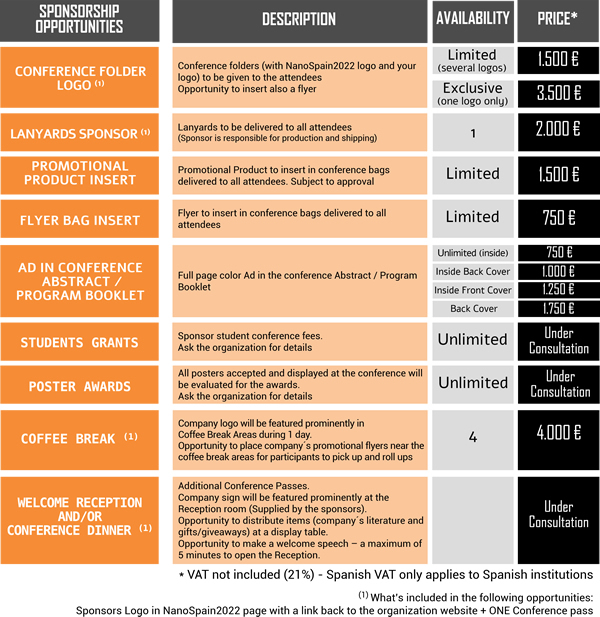 Sponsorship opportunities are designed to meet your business development goals and objectives. NanoSpain2022 offers a tremendous opportunity to market to one of the current largest R&D community..