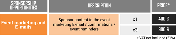 Opportunity to include the event sponsors' content in the marketing email, confirmations, and event reminders. Give the sponsors the opportunity to create content that relates to the topic of the event that can be distributed in one of these email communications.