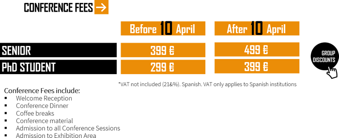 Spanish VAT (21%) is applicable on all conference registration fees to individuals, EU institutions without valid VAT number, Spanish institutions/companies (Business transaction subject to article 69/70 of Spanish VAT Law).