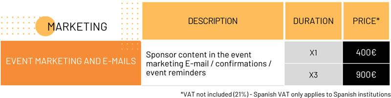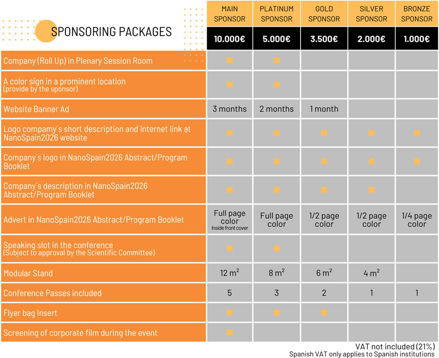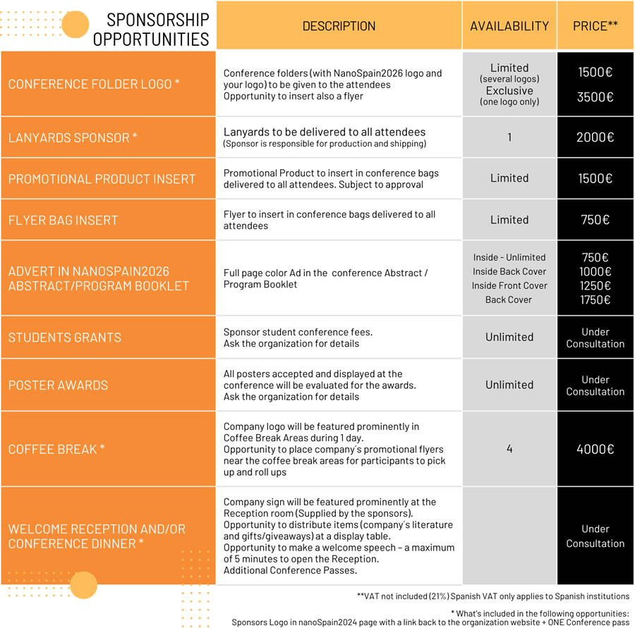Sponsorship opportunities are designed to meet your business development goals and objectives. NanoSpain2026 offers a tremendous opportunity to market to one of the largest 2026 European gatherings of NanoSpain2026.