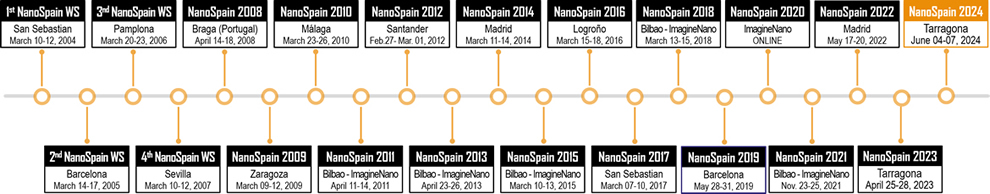 As a direct and most effective way to enhance the interaction between our network members, a first network meeting was organised in San Sebastian (March 10-12, 2004) with around 210 participants registered. Due to this success, the network decided organising its annual meeting, Barcelona (March 14-17,2005), Pamplona (March 20-23, 2006), Sevilla (March, 12-15, 2007), Braga-Portugal (April 14-18, 2008), Zaragoza (March 09-12, 2009), Málaga (March 09-12, 2010), Bilbao (April 11-14, 2011) Santander (February 27 - March 01, 2012) Bilbao (April 23-26, 2013), Madrid (March 11-14, 2014) Bilbao (April 10-13, 2015), Logroño (March 15-18, 2016), San Sebastian (March 07-10 March, 2017), Bilbao (March 13-15, 2018), Barcelona (May 28-31, 2019), Online (Sep 29 - Oct 01, 2020), Bilbao (November 23-25, 2021), Madrid (May 17-20, 2022), Tarragona (April 25-28, 2023) with a similar format. Its objective was also to facilitate the dissemination of knowledge and promote interdisciplinary discussions among the different NanoSpain groups. In order to organise the various sessions and to select contributions, the meeting was structured in the following thematic lines, but interactions among them were promoted: |
